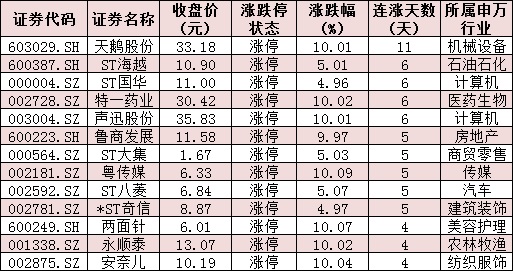 表:連續(xù)上漲4日且今日收盤漲停個(gè)股情況: