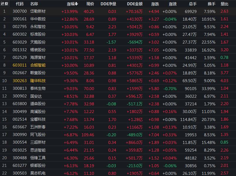 11月21日,機(jī)械設(shè)備行業(yè)漲幅居首,達(dá)1.22%。其中,天鵝股份、永和智控、標(biāo)準(zhǔn)股份、合鍛智能、錫裝股份、ST中捷、海源復(fù)材等7只概念股集體漲停。