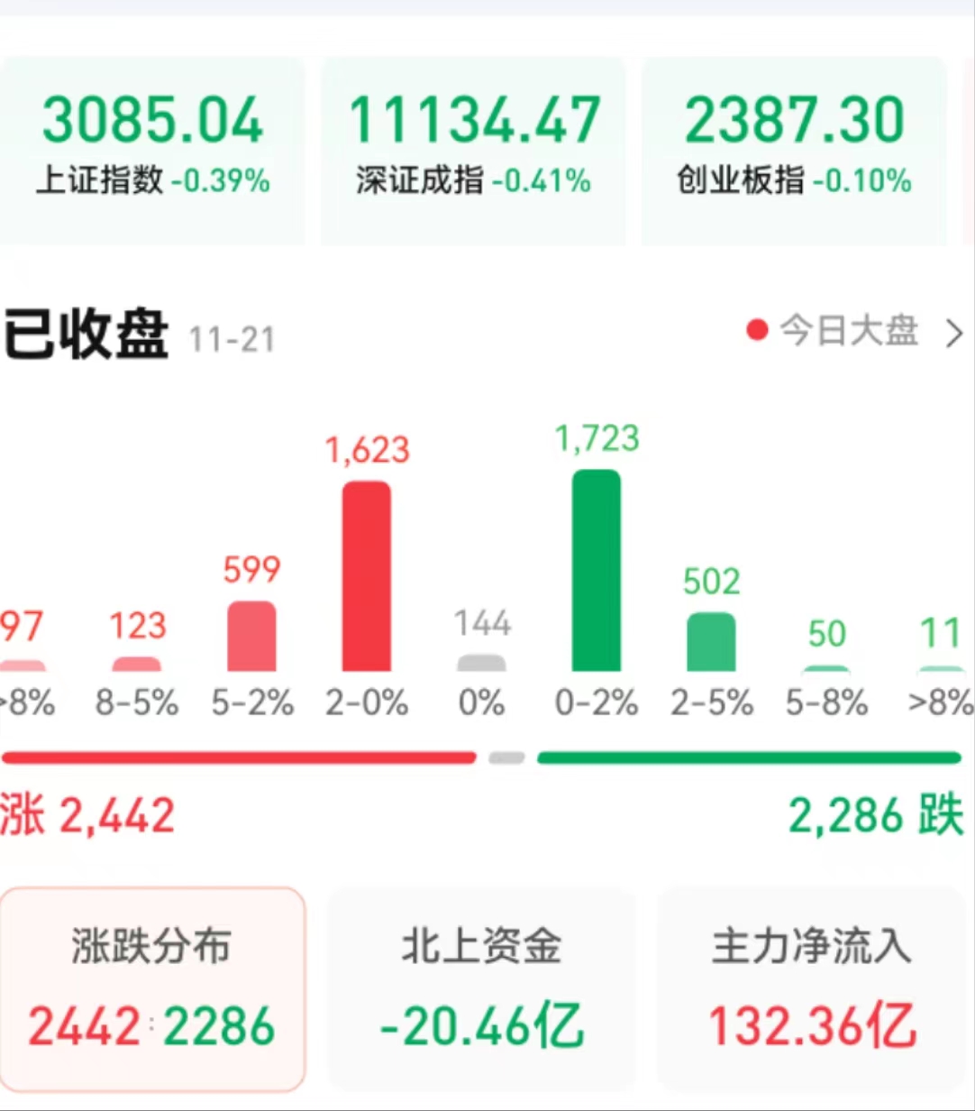 周一(11月21日),A股三大指數(shù)震蕩走弱。截至收盤,上證指數(shù)跌0.39%報(bào)3085.04點(diǎn),深證成指跌0.41%報(bào)11134.47點(diǎn),創(chuàng)業(yè)板指跌0.1%報(bào)2387.3點(diǎn),北證50指數(shù)漲2.55%;兩市合計(jì)成交額8492億元,北向資金凈賣出20.46億元??傮w來看,兩市個(gè)股漲多跌少。
