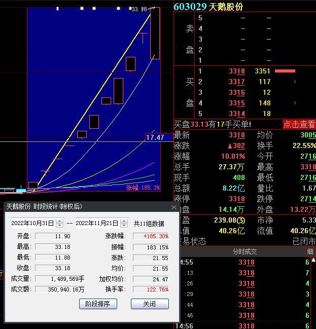 11月21日,熱門股天鵝股份今日復(fù)牌再度漲停,截至收盤,報(bào)33.18元,自10月31日至今,實(shí)現(xiàn)連續(xù)11個(gè)交易日漲停,累計(jì)漲幅達(dá)185.3%,此前10連板被特停5個(gè)交易日。