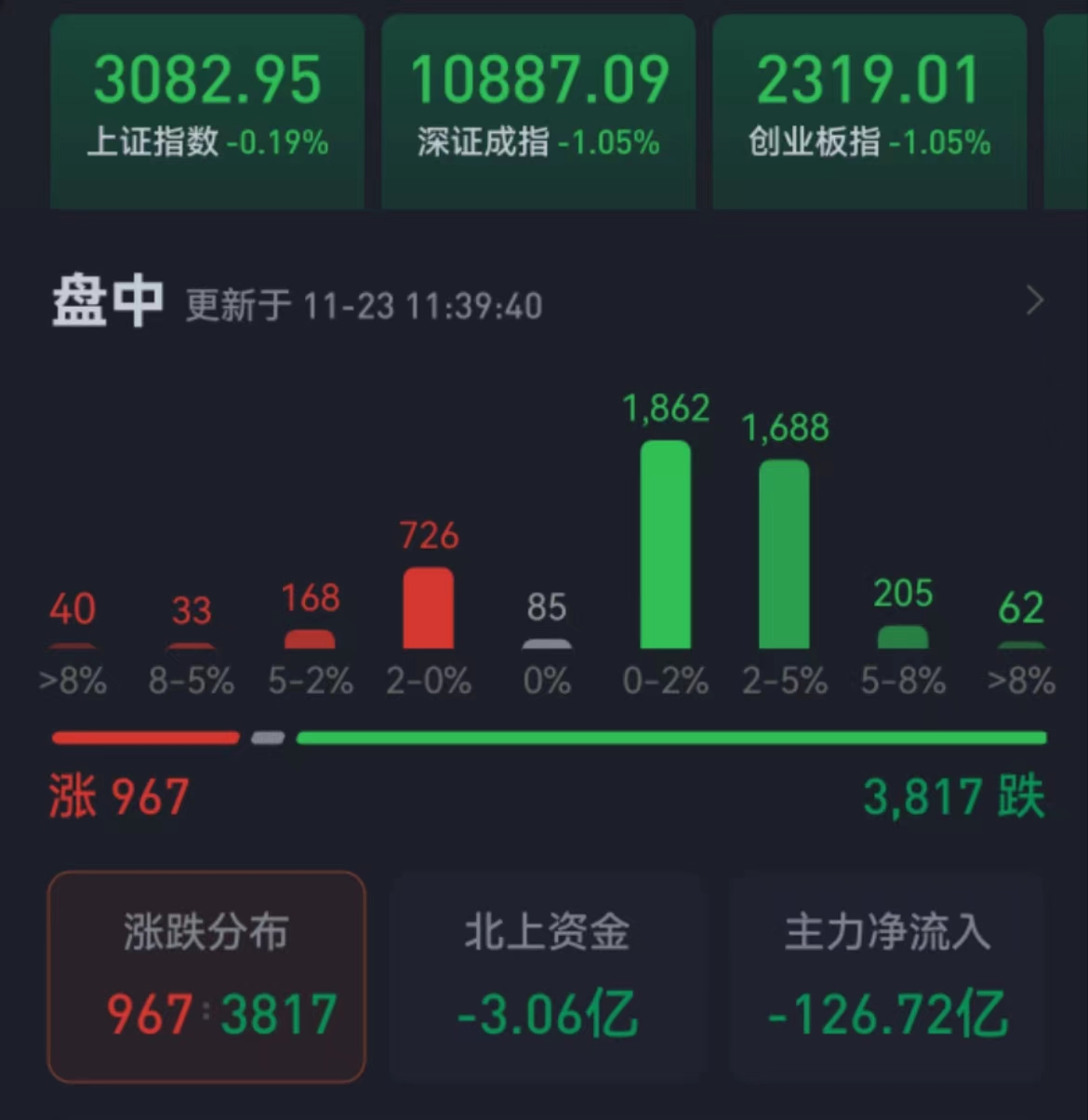 周三(11月23日),三大股指震蕩回落。截至上午收盤,上證指數(shù)跌幅達0.19%,報3082.95點;深證成指和創(chuàng)業(yè)板指跌幅均為1.05%;滬深兩市合計成交額5363.4億元,總體來看,兩市個股跌多漲少。
