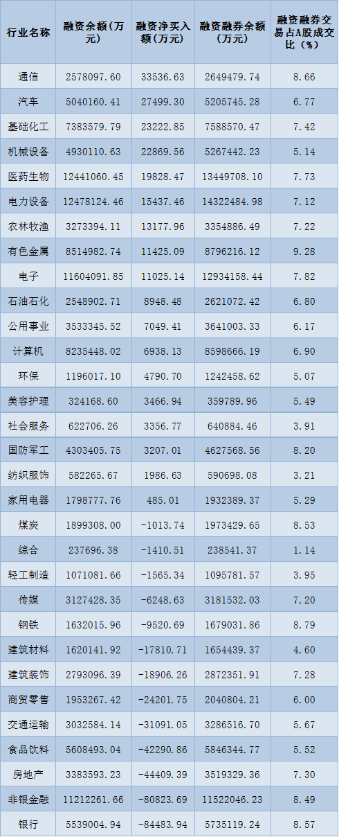 表:11月30日申萬一級行業(yè)兩融交易情況: