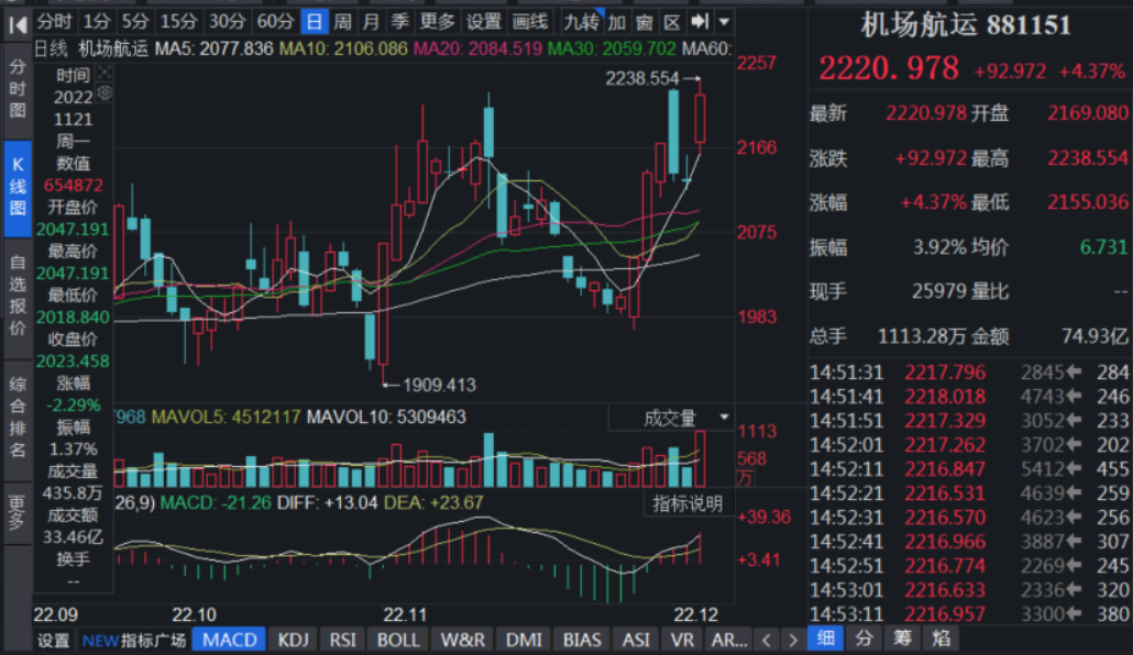 12月5日,最新公布的11月財新中國通用服務(wù)業(yè)經(jīng)營活動指數(shù)(服務(wù)業(yè)PMI)錄得46.7,雖然該指數(shù)較10月下降1.7個百分點,但服務(wù)業(yè)中的一些細分領(lǐng)域市場回暖預期正持續(xù)強化。當日,A股市場機場航運板塊表現(xiàn)十分強勢,截至收盤,同花順機場航運行業(yè)指數(shù)上漲4.37%,跑贏上證指數(shù)(漲幅1.76%)。機場航運板塊的13只個股全部實現(xiàn)上漲。個股方面,海航控股漲停,廈門空港、海南機場和白云機場漲幅也均超過5%。11月1日至12月5日,機場航運指數(shù)期間累計上漲14.72%,大幅跑贏上證指數(shù)(期間累計漲幅11%)。
