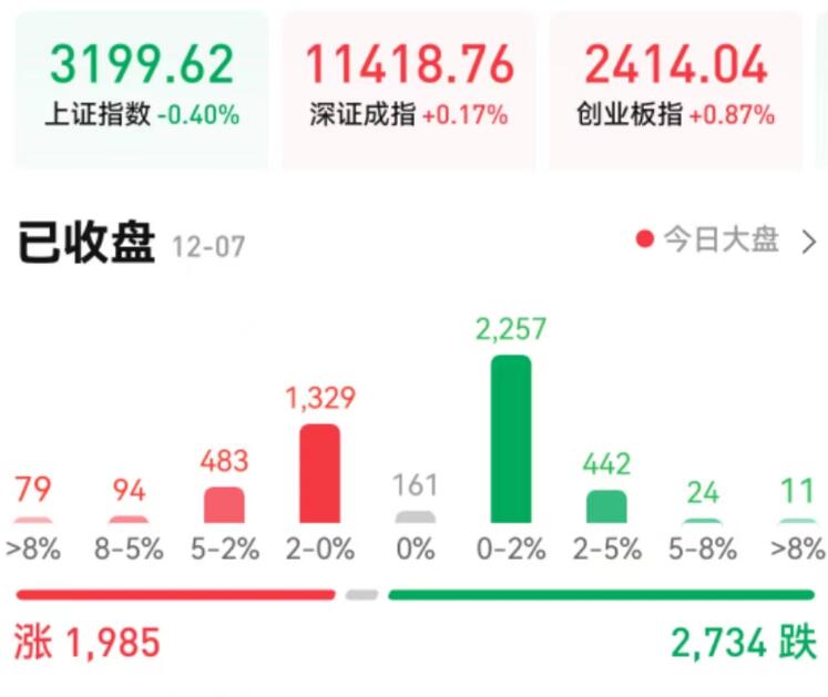 12月7日,A股三大指數(shù)震蕩分化,漲跌不一。截至收盤,上證指數(shù)跌0.4%報3199.62點,深證成指漲0.17%報11418.76點,創(chuàng)業(yè)板指漲0.87%報2414.04點;兩市合計成交9486億元,北向資金凈買入2.74億元??傮w上看,A股個股跌多漲少,市場交投熱度略有降低。