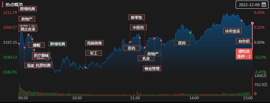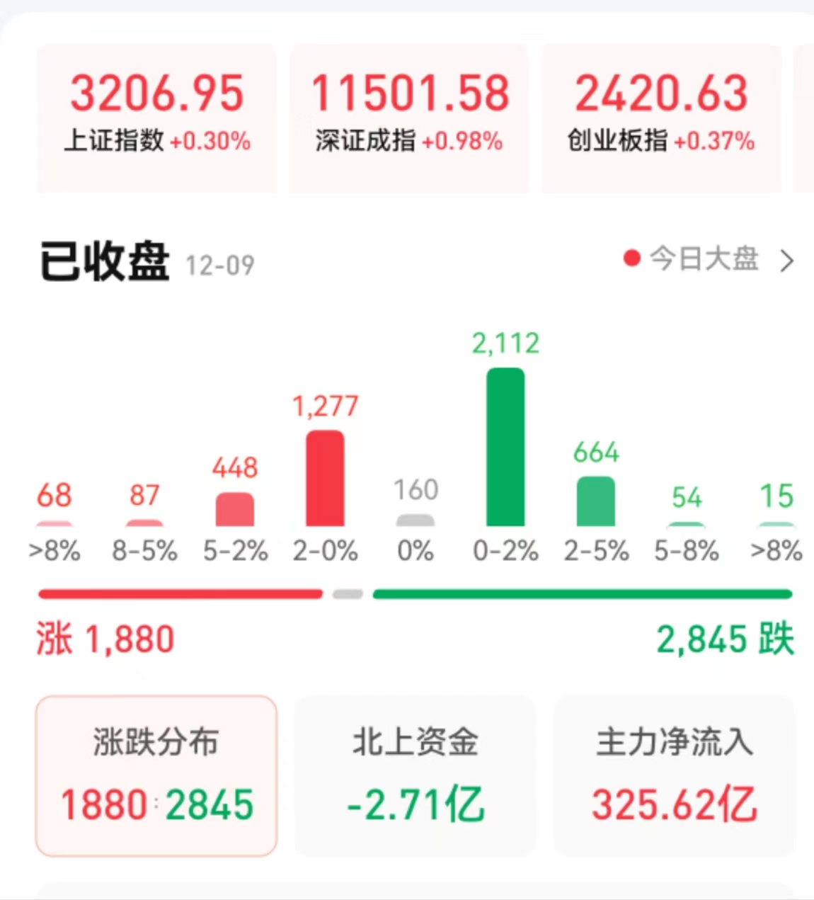 12月9日,A股三大指數(shù)震蕩攀升,全線收漲。截至收盤,上證指數(shù)漲0.3%報3206.95點,重返3200點整數(shù)關(guān)口之上,深證成指漲0.98%報11501.58點,創(chuàng)業(yè)板指漲0.37%報2420.63點;兩市合計成交金額達10091億元,北向資金凈賣出2.71億元??傮w上看,A股個股跌多漲少,市場分化加劇。