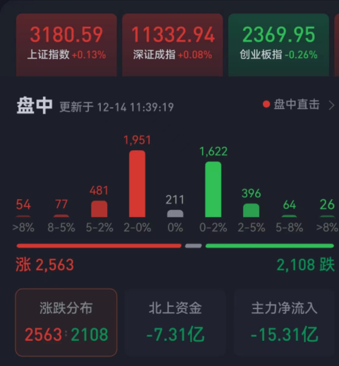 周三(12月14日),三大股指繼續(xù)震蕩分化,漲跌不一。截至上午收盤,上證指數(shù)上漲0.13%,報(bào)3180.59點(diǎn);深證成指漲幅為0.08%,創(chuàng)業(yè)板指跌幅為0.26%;滬深兩市合計(jì)成交額4939.9億元,總體來看,兩市個股漲多跌少。其中,漲停個股40只,跌停個股4只。