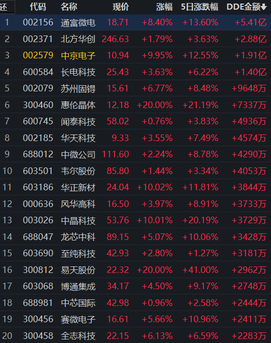 從早盤資金流向看,半導體及元件行業(yè)大單資金凈流入額達19.98億元,居首,此外,醫(yī)藥商業(yè)和計算機應(yīng)用大單資金凈流入額均超6億元。資金流入居首的半導體及元件行業(yè)交易中的173只個股,有150只上漲,其中20只漲幅超5%。