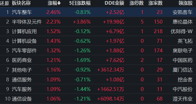 同花順行業(yè)方面,截至12月15日11:30,76類行業(yè)中34類上漲,占比44.74%,其中,汽車整車行業(yè)漲幅居首,達2.46%,此外,半導體及元件漲幅超2%。貴金屬跌幅居首,達2.61%。
