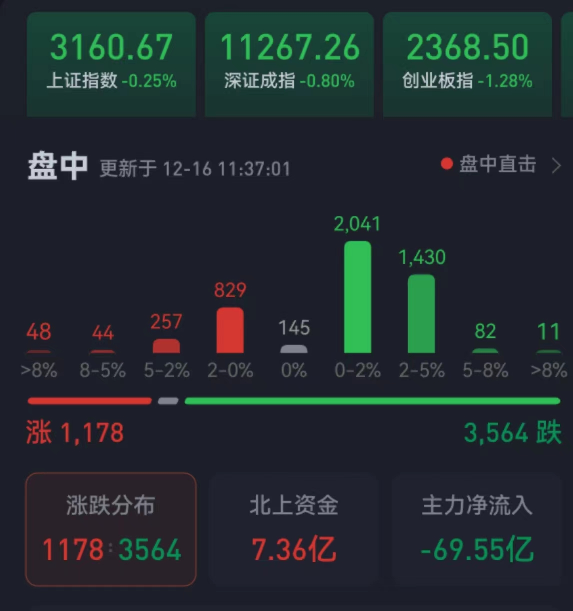 周五(12月16日),三大股指繼續(xù)震蕩回落。截至上午收盤,上證指數(shù)跌幅為0.25%,報(bào)3160.67點(diǎn);深證成指跌幅為0.80%,創(chuàng)業(yè)板指跌幅為1.28%;滬深兩市合計(jì)成交額4680.8億元,總體來(lái)看,兩市個(gè)股跌多漲少,超3000只個(gè)股下跌,其中,漲停個(gè)股27只,跌停個(gè)股5只。