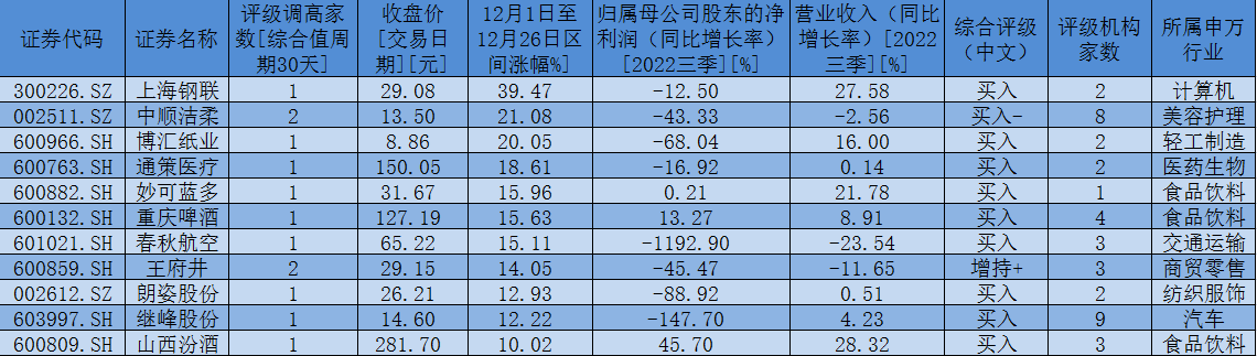 從市場(chǎng)表現(xiàn)來看,12月份(12月1日至12月26日),上述76只獲得調(diào)高評(píng)級(jí)的個(gè)股中有40只個(gè)股期間累計(jì)漲幅跑贏上證指數(shù)(期間累計(jì)跌幅2.72%),占比超五成,其中,上海鋼聯(lián)(39.47%)、中順潔柔(21.08%)、博匯紙業(yè)(20.05%)3只個(gè)股期間累計(jì)漲幅均超20%。