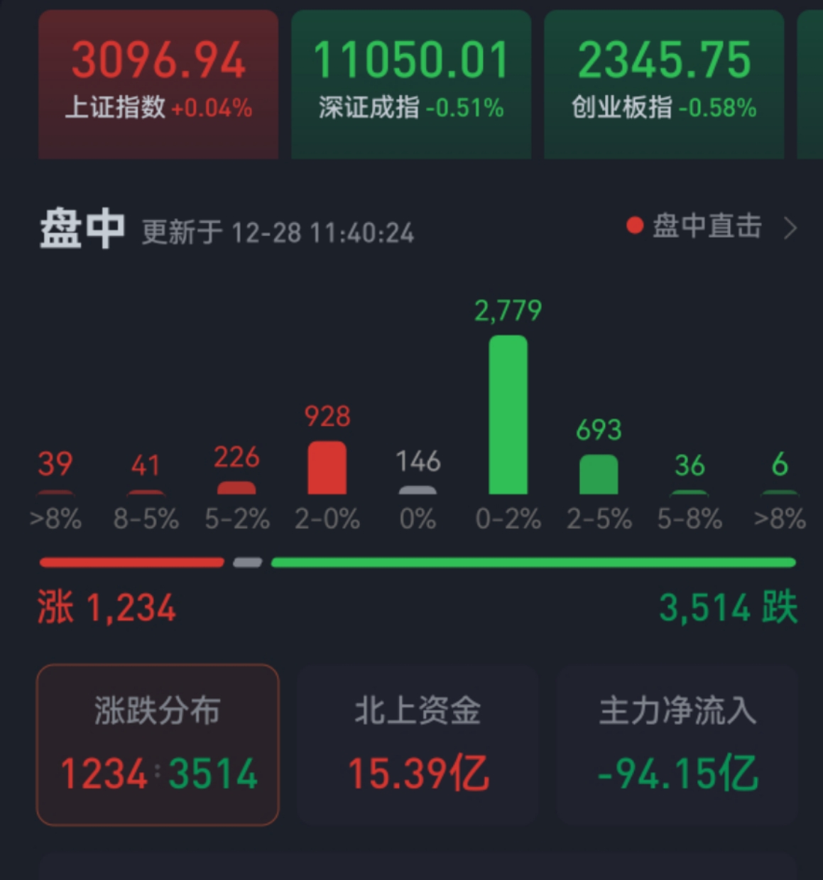 周三(12月28日),三大股指繼續(xù)震蕩分化。截至上午收盤(pán),上證指數(shù)漲0.04%,報(bào)3096.94點(diǎn),逼近3100點(diǎn)關(guān)口;深證成指跌幅為0.51%,創(chuàng)業(yè)板指跌幅為0.58%;滬深兩市合計(jì)成交額4116.6億元,總體來(lái)看,兩市個(gè)股跌多漲少,其中,漲停個(gè)股達(dá)28只,跌停7只。