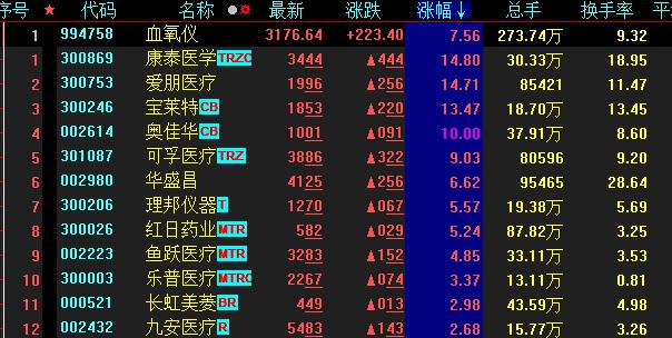 具體看,截至12月28日上午收盤(pán),血氧儀板塊表現(xiàn)搶眼,漲幅達(dá)7.56%。其中,康泰醫(yī)學(xué)、愛(ài)朋醫(yī)療、寶萊特、奧佳華等概念股漲幅均在10%及以上。