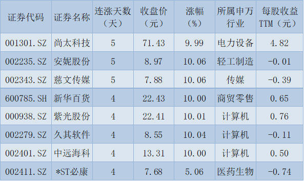 表:連續(xù)上漲4日且今日收盤漲停股一覽