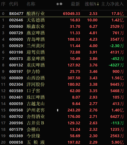 從早盤表現(xiàn)強(qiáng)勢(shì)的釀酒行業(yè)看,交易中的40只成份股全線上漲,其中有1只封漲停板。資金流向看,釀酒行業(yè)大單資金凈流入額為17.8億元,居行業(yè)第1位。