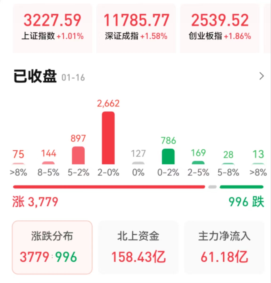 周一(1月16日),A股三大指數(shù)震蕩上行,全線飄紅。截至收盤,上證指數(shù)漲1.01%報(bào)3227.59點(diǎn),深成指漲1.58%報(bào)11785.77點(diǎn),創(chuàng)業(yè)板指漲1.86%報(bào)2539.52點(diǎn);兩市合計(jì)成交9171億元,創(chuàng)近一個(gè)月新高。北向資金凈買入158.43億元。總體上看,兩市個(gè)股漲多跌少,其中,漲停個(gè)股達(dá)49只,跌停個(gè)股達(dá)12只。