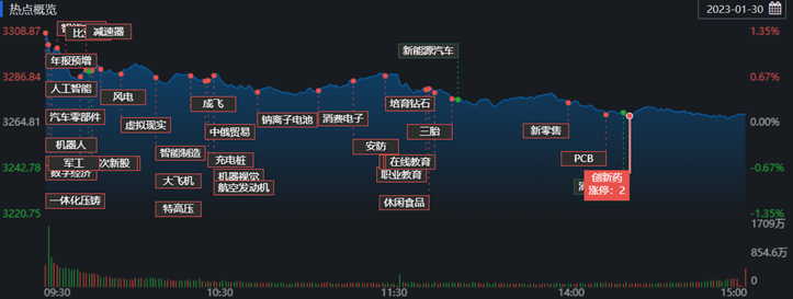 1月30日,A股三大指數(shù)高開震蕩,午盤后在權重股帶動下出現(xiàn)回落過程。截至收盤,上證指數(shù)漲0.14%報3269.32點;深證成指漲0.98%報12097.76點,創(chuàng)業(yè)板指漲1.08%報2613.89點,A股合計成交額10617.69億元,較前一交易日增長41.78%,北向資金凈買入186.14億元,這是北向資金連續(xù)第14個交易日凈買入,同時,單日凈買入額也創(chuàng)2021年12月以來新高??傮w上看,A股個股漲多跌少,有3824只上漲,1114只下跌。