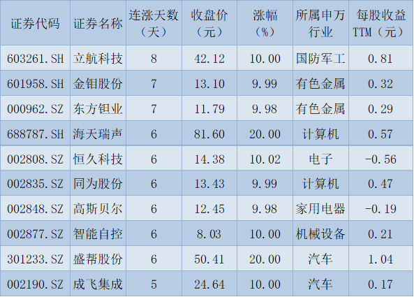 表:連續(xù)上漲5日且今日收盤漲停股一覽