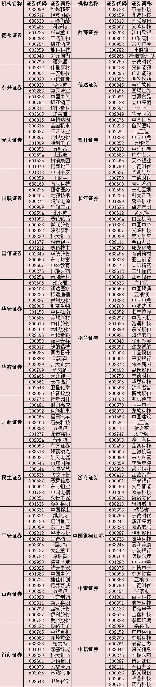 從券商推薦的181只金股看,有30只個(gè)股獲2家及以上券商推薦。其中,五糧液被招商證券、開(kāi)源證券、山西證券、光大證券、中泰證券、粵開(kāi)證券等6家券商共同選入2月份金股;中國(guó)中免也獲中國(guó)銀河證券、招商證券、山西證券、長(zhǎng)江證券、東興證券、粵開(kāi)證券等6家券商集體推薦;寧德時(shí)代贏得中國(guó)銀河證券、招商證券、信達(dá)證券、中泰證券、長(zhǎng)江證券、粵開(kāi)證券共6家券商聯(lián)合推薦;比亞迪也獲招商證券、信達(dá)證券、國(guó)聯(lián)證券、光大證券、粵開(kāi)證券等5家券商共同選入2月份金股。另外,東方財(cái)富、平安銀行、恒瑞醫(yī)藥、伊利股份、旗濱集團(tuán)、科大訊飛等6只個(gè)股也受到3家券商推薦。
