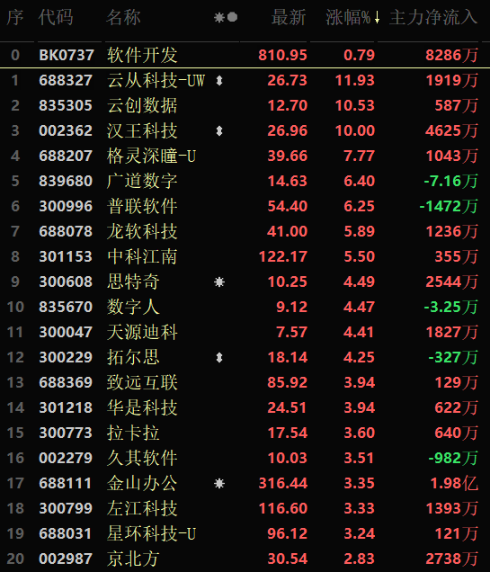 從早盤表現(xiàn)相對強(qiáng)勢的軟件開發(fā)行業(yè)看,交易中的177只成份股有98只上漲,其中,漢王科技封漲停板,另有7只個(gè)股漲超5%。資金流向看,該行業(yè)大單資金凈流入額為8286萬元,居行業(yè)第3位。