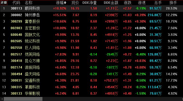 具體看,截至3月20日上午收盤,手機游戲板塊漲幅居首達3.89%。其中,順網科技、神州泰岳、富春股份等概念股漲幅均超10%。