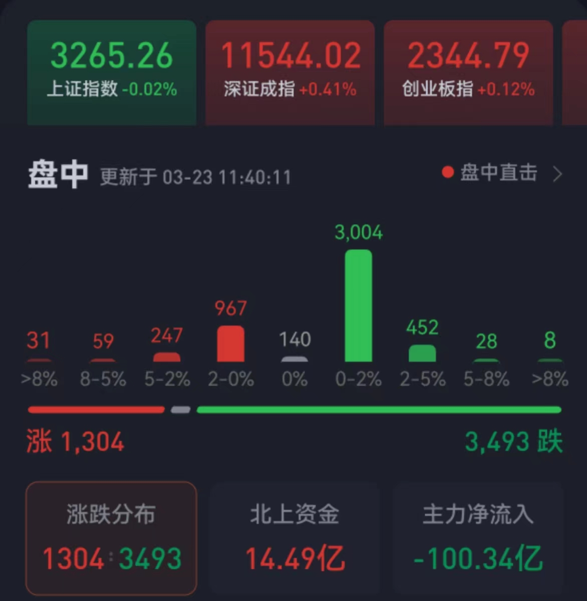 周四(3月23日),三大股指繼續(xù)震蕩分化,漲跌不一。截至上午收盤,上證指數(shù)跌幅0.02%,報3265.26點;深證成指和創(chuàng)業(yè)板指漲幅分別為0.41%和0.12%;滬深兩市合計成交額6040.9億元,總體來看,兩市個股跌多漲少。