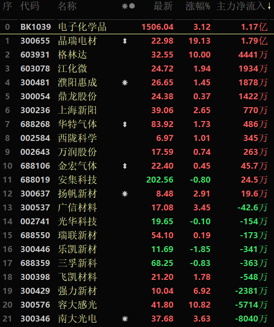 從早盤表現(xiàn)強(qiáng)勢的電子化學(xué)品行業(yè)看,該行業(yè)交易中的21只成份股中有17只上漲,其中,有4只個(gè)股漲幅超5%。資金方面,有1.17億元大單資金凈流入該行業(yè),居各行業(yè)資金凈流入排名第9位。