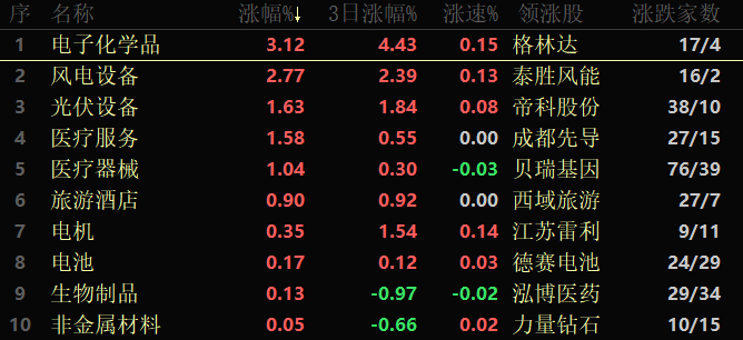 東方財(cái)富行業(yè)方面,截至3月27日11:30,86個(gè)行業(yè)板塊中10類上漲,占比11.63%,其中,電子化學(xué)品行業(yè)漲幅居首,達(dá)3.12%,另有風(fēng)電設(shè)備、光伏設(shè)備、醫(yī)療服務(wù)和醫(yī)療器械等行業(yè)漲幅均超1%。下跌方面,保險(xiǎn)跌幅居首,達(dá)2.31%,另有房地產(chǎn)服務(wù)、游戲、水泥、建材房和地產(chǎn)開發(fā)等行業(yè)跌幅超2%。