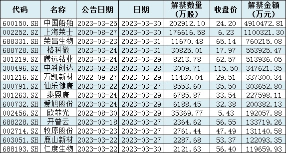 與此同時(shí),統(tǒng)計(jì)顯示,下周(3月27日-31日)共有71家公司限售股陸續(xù)解禁,按最新收盤價(jià)計(jì)算,解禁市值為1087.4億元。從解禁市值來看,中國(guó)船舶(491.05億元)、上海萊士(110.03億元)、榮昌生物(76.02億元)、格科微(55.39億元)、騰遠(yuǎn)鈷業(yè)(51.39億元)等公司解禁金額均超50億元。
