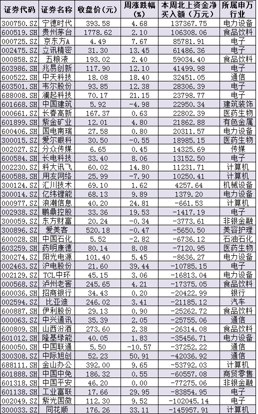資金方面,本周北向資金累計(jì)凈買入金額達(dá)109.50億元。從前十大成交活躍股來看,本周,寧德時(shí)代、貴州茅臺(tái)等2只個(gè)股,北向資金凈買入金額均超10億元。另外,同花順、紫光國(guó)微等個(gè)股遭北向資金凈賣出金額均超10億元。