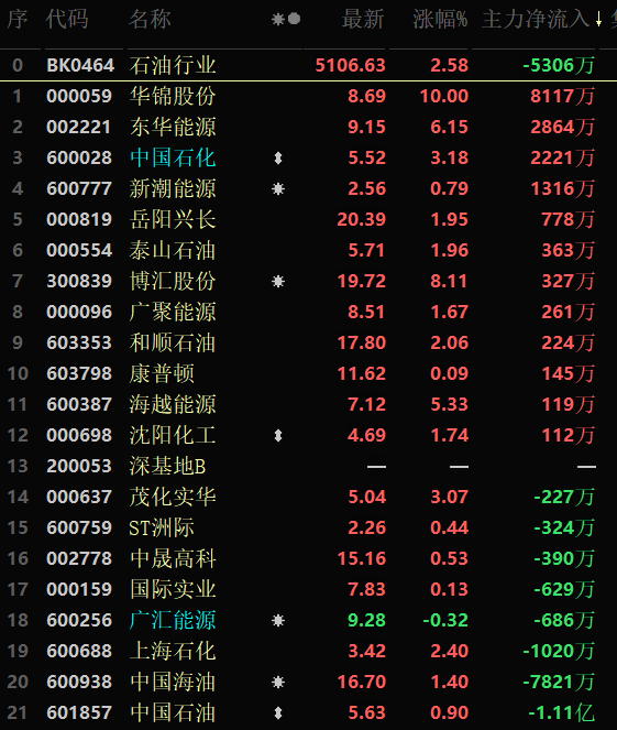 從早盤(pán)表現(xiàn)強(qiáng)勢(shì)的石油行業(yè)看,該行業(yè)交易中的20只成份股中有19只上漲,其中,有4只個(gè)股漲幅超5%。資金方面,有-5306萬(wàn)元大單資金凈流入該行業(yè),居各行業(yè)資金凈流入排名第33位。