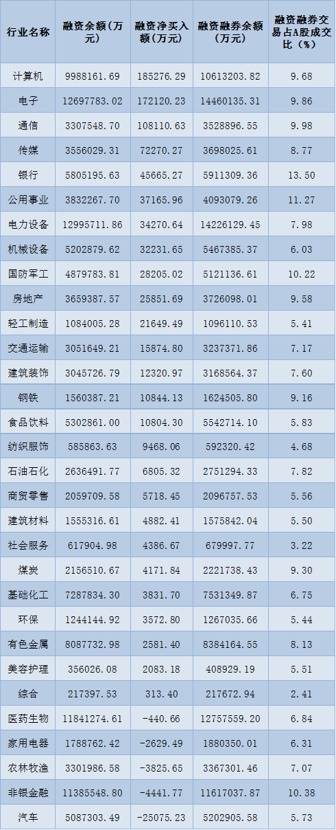 表:3月27日申萬(wàn)一級(jí)行業(yè)兩融交易情況: