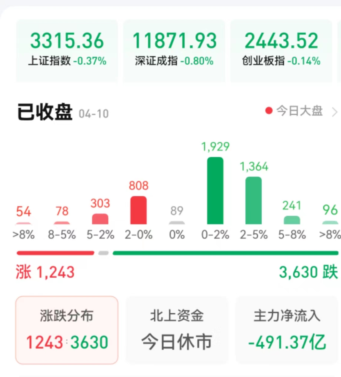 周一(4月10日),A股三大股指震蕩回落。截至收盤,上證指數(shù)跌0.37%報3315.36點,深證成指跌0.8%報11871.93點,創(chuàng)業(yè)板指跌0.14%報2443.52點,科創(chuàng)50指數(shù)跌2.74%;兩市合計成交額達12255億元,連續(xù)第五個交易日突破1萬億元??傮w上看,兩市個股跌多漲少。其中,漲停個股達22只,跌停個股達25只。