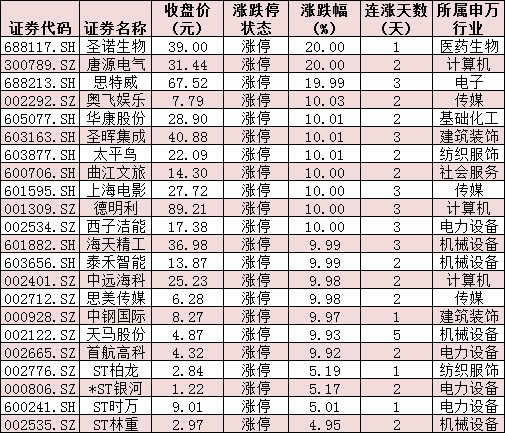 表:今日收盤漲停個股情況: