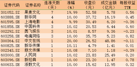 漲停股方面,今日有33只個(gè)股以漲停價(jià)報(bào)收,有13只個(gè)股屬傳媒行業(yè),占比近四成,其中中文在線、果麥文化20CM漲停,奧飛娛樂(lè)3連板。