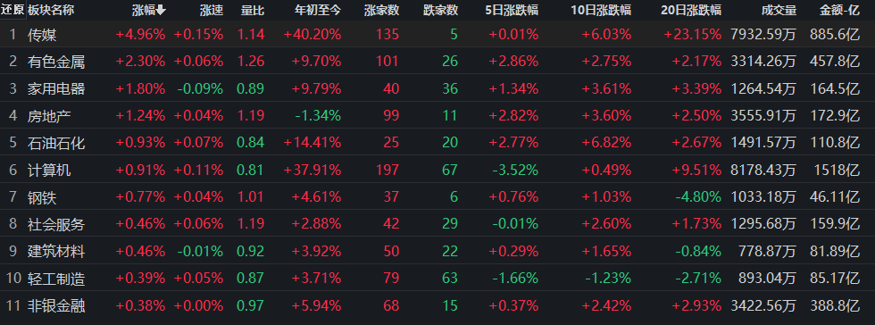 4月11日,A股三大指數(shù)尾盤(pán)拉升漲跌互現(xiàn),滬指3300點(diǎn)失而復(fù)得,A股成交金額連續(xù)6個(gè)交易日超萬(wàn)億元。傳媒板塊領(lǐng)漲,多只傳媒股漲停。