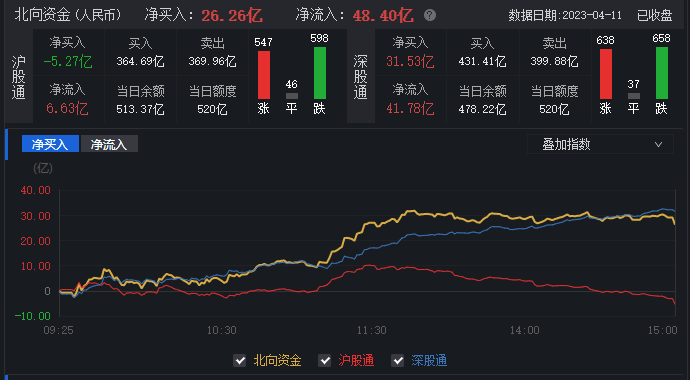 4月11日,截至收盤(pán),上證指數(shù)跌0.05%報(bào)3313.57點(diǎn),深證成指漲0.04%報(bào)11877.15點(diǎn),創(chuàng)業(yè)板指跌0.17%報(bào)2439.40點(diǎn),A股合計(jì)成交額10834.59億元;北向資金全天凈買(mǎi)入26.26億元,其中滬股通凈賣(mài)出5.27億元,深股通凈買(mǎi)入31.53億元。今日A股中有2295只上漲,2485只下跌。
