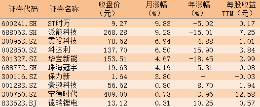 截至4月18日收盤,鋰電池行業(yè)內(nèi)28家公司中12家公司股價實(shí)現(xiàn)月內(nèi)上漲,其中,ST時萬、派能科技等個股累計(jì)月漲幅居前,分別為9.83%、9.28%。