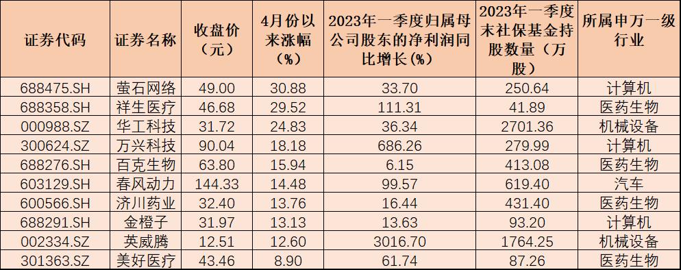 表:4月份以來社保基金重倉股漲幅居前十個(gè)股一覽