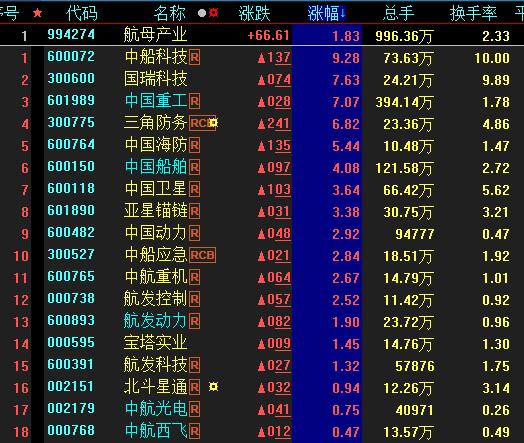 對此,中信建投證券分析認(rèn)為,航母產(chǎn)業(yè)板塊進(jìn)入戰(zhàn)略配置期,首選優(yōu)選民參軍公司,關(guān)注混改階段性機(jī)會。在標(biāo)的選擇上,首推相關(guān)龍頭公司,尤其是市場化程度較高、上市公司核心資產(chǎn)占比高、受益于產(chǎn)業(yè)鏈業(yè)績釋放的中航系上市公司。其次推薦技術(shù)門檻較高,市場空間大,具備核心競爭力與先發(fā)優(yōu)勢且估值合理的民參軍公司。同時還可以關(guān)注混改帶來的階段性機(jī)會,主要是南船、兵器、航天集團(tuán)中的小市值公司。推薦標(biāo)的:中直股份、中航機(jī)電、中航光電、中國動力、國睿科技、天銀機(jī)電、航新科技、海蘭信等。