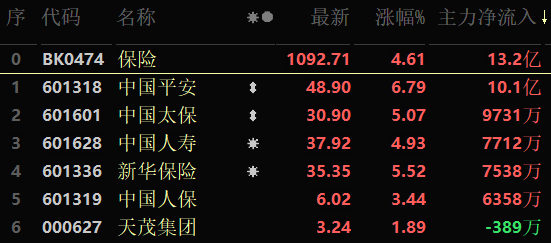 從早盤(pán)表現(xiàn)強(qiáng)勢(shì)的保險(xiǎn)行業(yè)看,交易中的6只成份股全線(xiàn)上漲,其中,有3只個(gè)股漲幅超5%。資金方面,有13.2億元大單資金凈流入該行業(yè),居各行業(yè)第1位。