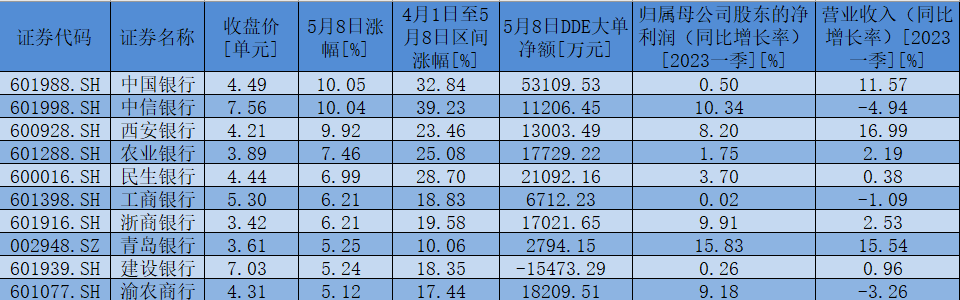 表:5月8日,銀行行業(yè)漲幅超5%個股一覽