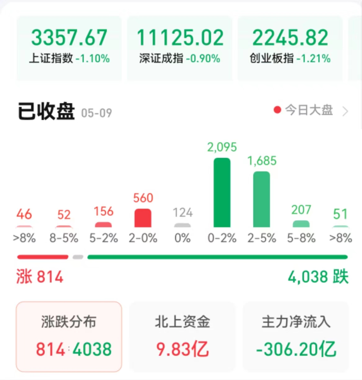 周二(5月9日),A股三大股指震蕩回落,全線下跌。截至收盤,上證指數(shù)跌1.1%報3357.67點,深證成指跌0.90%報11125.02點,創(chuàng)業(yè)板指跌1.21%報2245.82點;兩市合計成交金額12218億元,連續(xù)第23個交易日突破萬億元,北向資金凈買入9.83億元??傮w上看,兩市個股跌多漲少,超4000只個股下跌。其中,漲停個股達24只,跌停個股達72只。