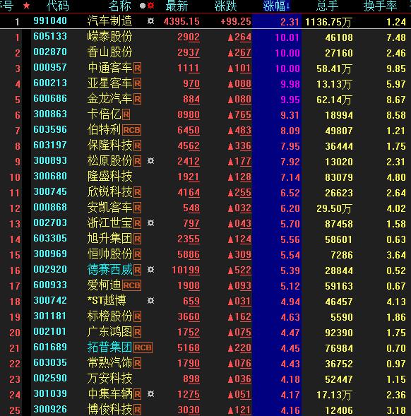 具體看,截至5月10日上午收盤,汽車制造板塊漲幅居首達2.31%。其中,嶸泰股份、香山股份、中通客車等多只概念股集體漲停。