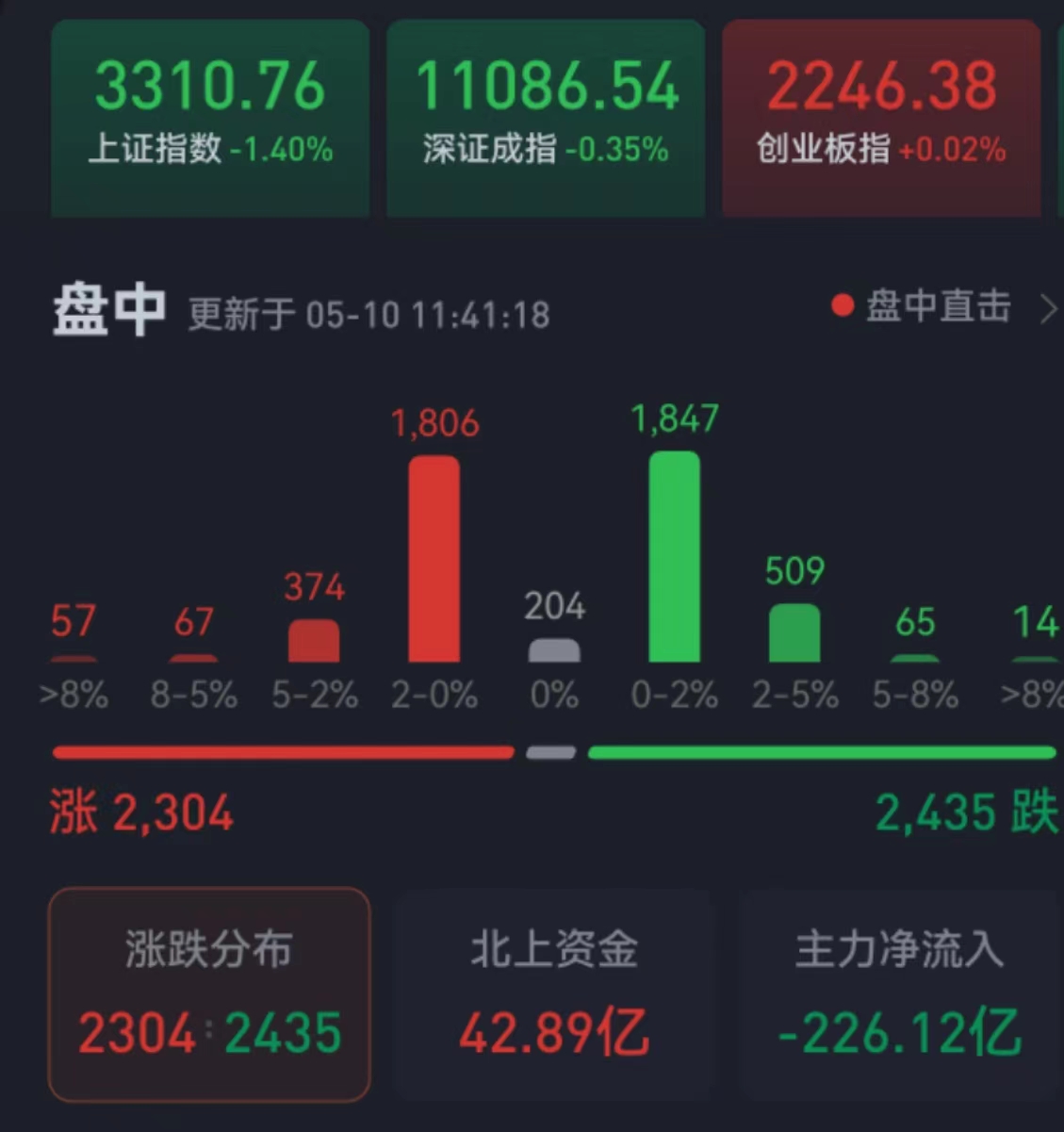 周三(5月10日),A股三大股指震蕩分化,漲跌不一。截至上午收盤,上證指數(shù)跌幅達1.40%,報3310.76點;深證成指跌幅達0.35%,創(chuàng)業(yè)板指漲幅為0.02%;滬深兩市合計成交額6453.2億元,總體來看,兩市個股跌多漲少。