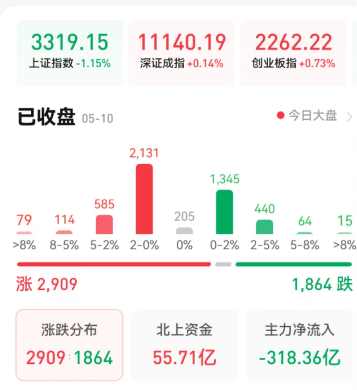 周三(5月10日),A股三大股指震蕩分化,漲跌不一。截至收盤,上證指數(shù)跌1.15%報(bào)3319.15點(diǎn),深證成指漲0.14%報(bào)11140.19點(diǎn),創(chuàng)業(yè)板指漲0.73%報(bào)2262.22點(diǎn);兩市合計(jì)成交金額達(dá)10201億元,連續(xù)第24個(gè)交易日突破萬(wàn)億元,北向資金凈買入55.71億元??傮w上看,兩市個(gè)股漲多跌少。其中,漲停個(gè)股達(dá)40只,跌停個(gè)股達(dá)49只。