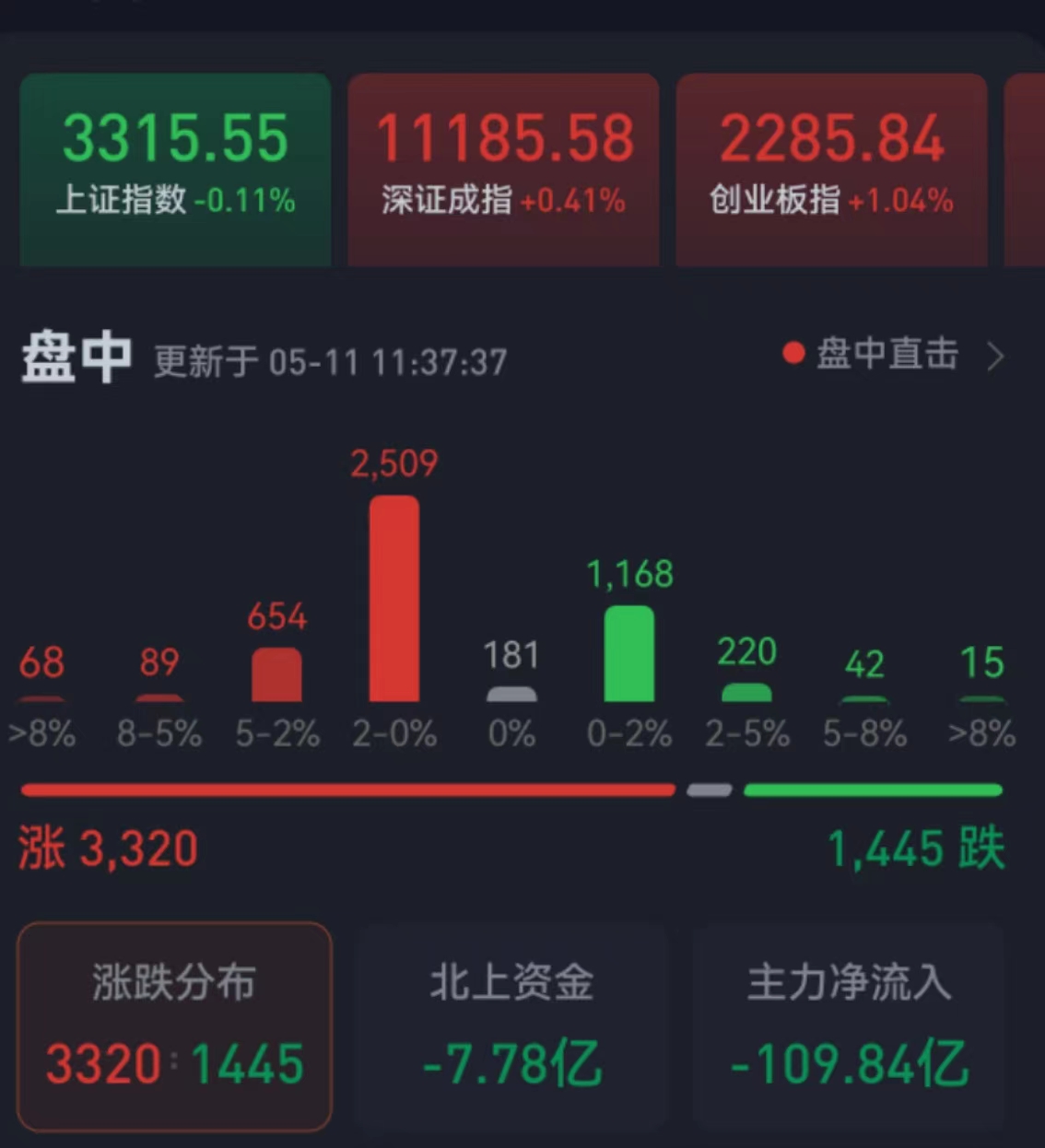 周四(5月11日),三大股指震蕩分化,漲跌不一。截至上午收盤,上證指數(shù)跌0.11%,報(bào)3315.55點(diǎn);深證成指漲0.41%,創(chuàng)業(yè)板指漲幅為1.04%;滬深兩市合計(jì)成交額5829.2億元,總體來看,兩市個(gè)股漲多跌少。
