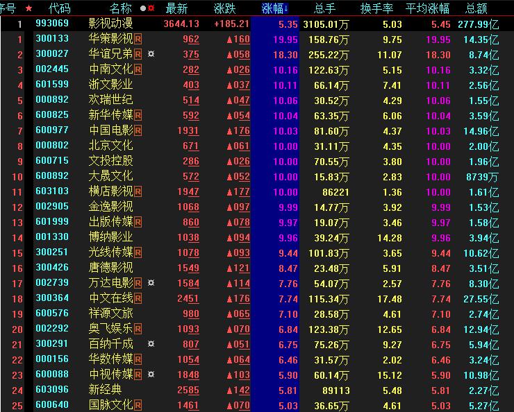 具體看,截至5月11日上午收盤,影視動(dòng)漫板塊漲幅居首達(dá)5.35%,掀起漲停潮。其中,包括華策影視、中南文化、新華傳媒、歡瑞世紀(jì)、中國電影、出版?zhèn)髅健M店影視等在內(nèi)的超10只概念股集體漲停。