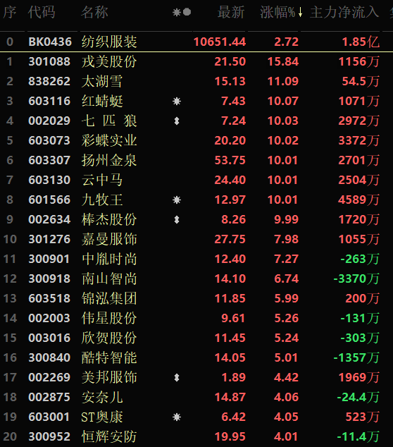 從早盤表現(xiàn)強(qiáng)勢的紡織服務(wù)行業(yè)看,交易中的103只成份股中有93只上漲,其中,有16只個(gè)股漲幅超5%。資金方面,有1.85億元大單資金凈流入該行業(yè),居各行業(yè)第3位。