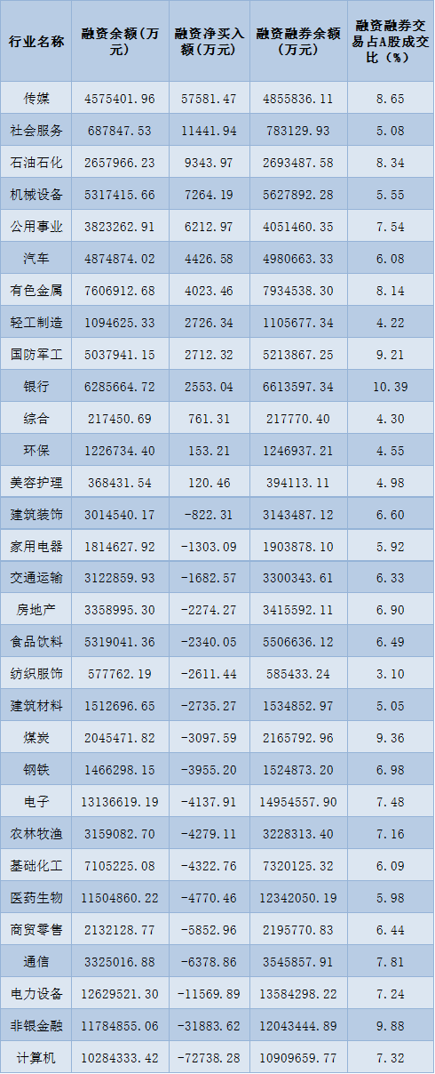 表:5月11日申萬一級(jí)行業(yè)兩融交易情況:
