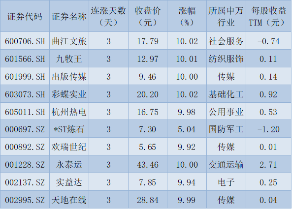 表:連續(xù)上漲3日且今日收盤漲停股一覽